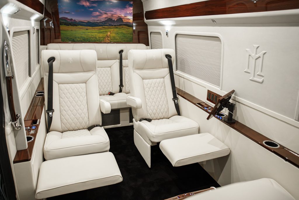 There are several luxury Sprinter vans to choose from, and even more customizations. Build the custom vehicle of your dreams with custom accents, technology, lighting, sound systems, security systems, and more. Most executive Sprinter van models come with kitchenettes, bathrooms, video conferencing, premium leather seating, airline-style writing tables, adjustable lighting, power window shades, 4k televisions, reclining chairs, state-of-the-art sound systems, and more. You can choose to customize your mobile office luxury Sprinter with bathroom featuring 24 karat gold, chrome, red Burl wood trim, Italian leather, suede, plush carpeting, and more.