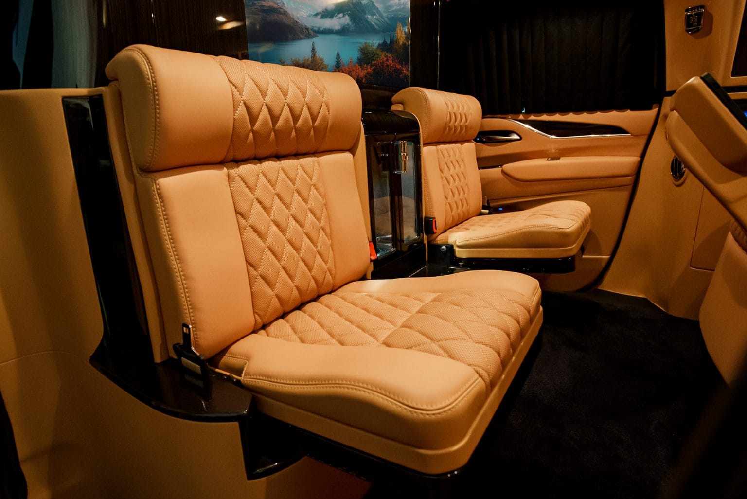 Experience unrivaled luxury in this custom Cadillac Escalade Executive interior featuring two six-way power executive Italian leather seats with ventilation and massage, paired with Lexani signature power jump seats with wood accents. The sophisticated cabin includes a privacy partition with 42″ 4K QLED TV, comprehensive connectivity through 5G Wi-Fi and video conferencing, premium bar with refrigerator, and secondary A/C System. Elegant details like ultra-suede headliner, ambient LED lighting, chrome fixtures, and plush carpeting complement practical features including airline tables, phone charging stations, and comprehensive security cameras—all creating an executive sanctuary on wheels.