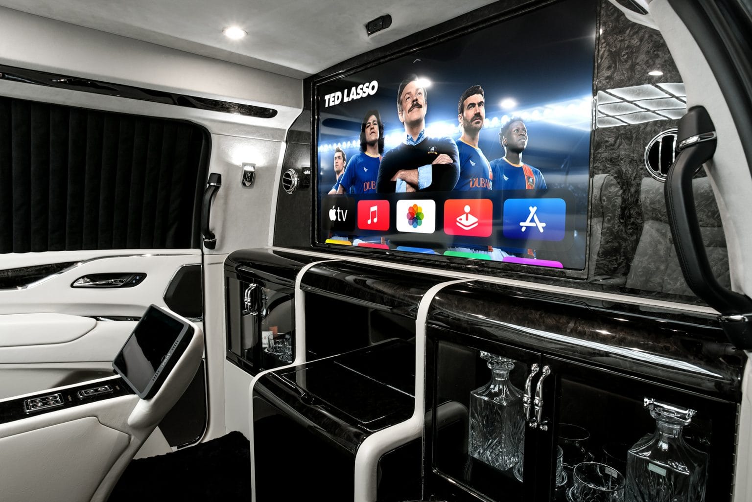 This exceptional Cadillac Escalade Executive interior maintains a discreet exterior appearance while transforming the interior into a sophisticated mobile office and relaxation space. This premium mobile office features dual 8-way Sky Captain powered executive seats in fine Linen Italian leather, complete with heating and massage functions. Stay connected with 5G Wi-Fi while enjoying entertainment on the spectacular 42″ QLED 4K TV mounted on our proprietary oversized privacy partition. The thoughtfully designed interior includes ambient overhead LED lighting, an Apple iPad with convenient docking station, and the Harmony screen management system for complete control at your fingertips. Conduct meetings or enjoy media with exceptional clarity through the Marantz 5.1 Surround sound system. Two airline-style writing tables enable productive work sessions, while the front security camera ensures peace of mind throughout your journey.