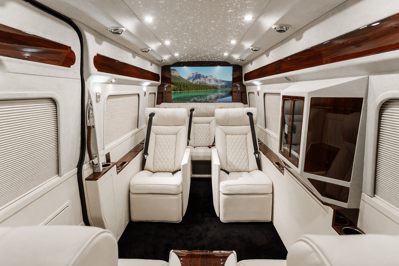 Business productivity is best accomplished within our “Belgravia” edition 170 Custom Mercedes Sprinter Van. Crafted to meet the demanding onsite needs of today’s business over achievers, this Mercedes luxury van modern version of business travel-on-the-go provides a perfect setting for Client presentations, Facility inspections, and Video conference calls. The Custom Mercedes Sprinter Interior is fully equipped with; Retractable meeting table, built-in MAC computer, 49″ Samsung TV’s, Beverage refrigerators, Ambient & Reading lights, and a secondary heavy duty AC system, you’ll experience both comfort and efficiency. And to further represent your companies’ professional image on the road, this Mercedes Sprinter Van custom interior includes; Color match Euro style body kit, Custom Lexani grille, and Lexani 18″ wheel package.
